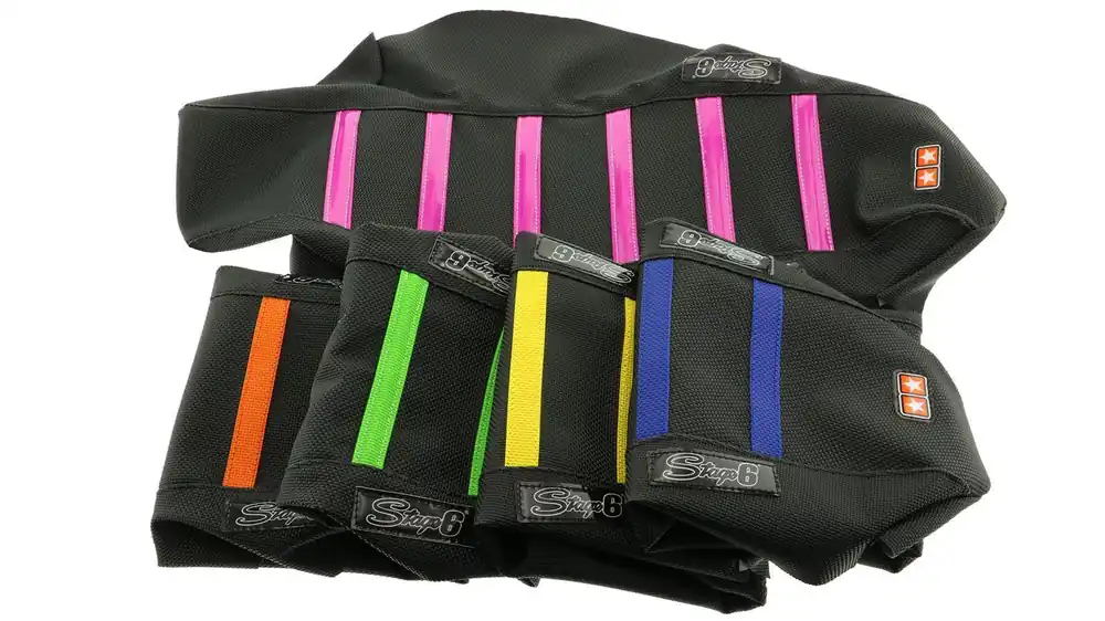 -> exzellenter Grip dank griffigem Oberflächenmaterial und 6 bunt abgesetzten Querstreifen und sportlicher Offroad Racing Look mit Seitenteilen aus Vinyl mit Stage6 Logo und bunter Grafik